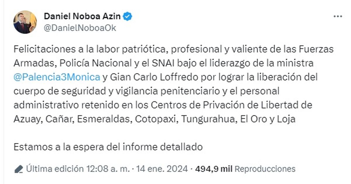 El mandatario felicitó a la fuerza pública y a sus ministros de Gobierno y de Defensa "por lograr la liberación" del personal penitenciario, en la red X.