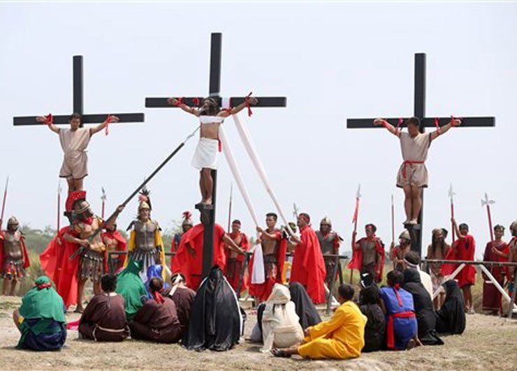 Rubén Enaje y otros 14 hombres, algunos a gritos, fueron clavados a cruces de madera por actores vestidos como centuriones romanos en San Pedro Cutud y otras dos aldeas arroceras en la provincia de Pampanga al norte de Manila, según los organizadores.