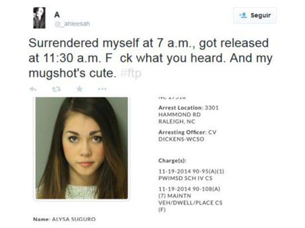 “Me entregué a las 7 a.m y fui liberada a las 11:30 a.m. Al carajo con lo que escuchaste. Y mi foto policial es linda #FTP (que se j@#$ la policía)”, escribió la joven en su cuenta de Twitter.