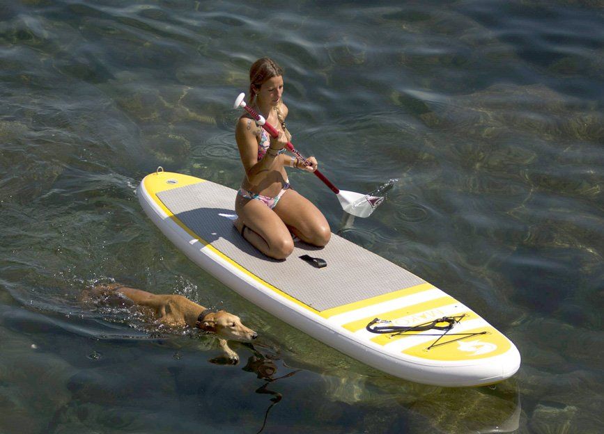 La foto del día.Una mujer rema en la parte superior de una tabla de surf con la compañía de su perro, que nada junto a ella en el Mar Mediterráneo en Barcelona, España.