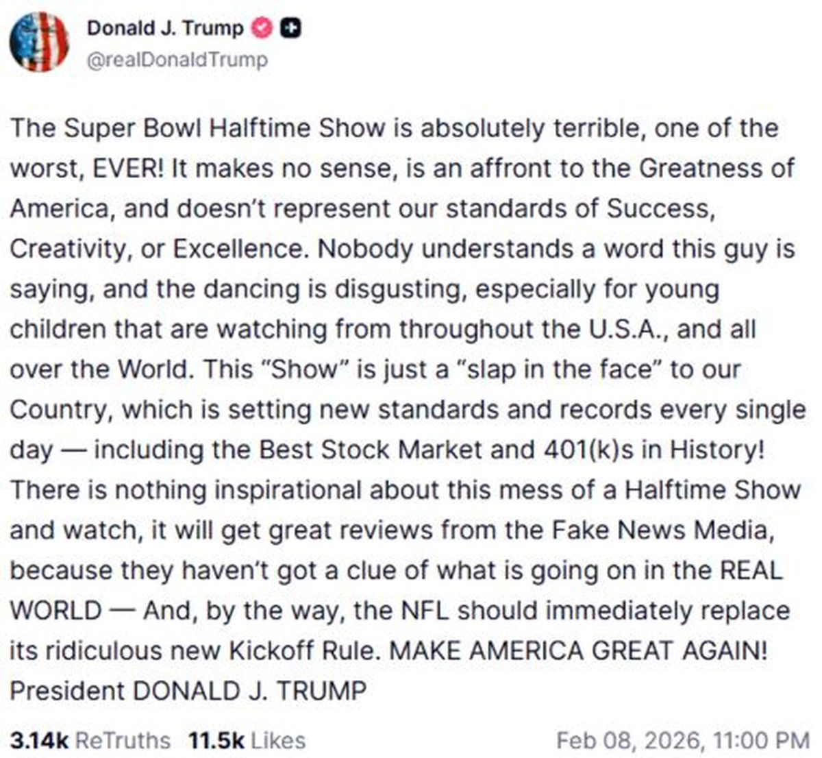 Mientras se desarrollaba la final deportiva en Santa Clara, California, Trump utilizó su plataforma Truth Social para expresar su descontento en tiempo real. "Nadie entiende una palabra de lo que dice este tipo", disparó el líder norteamericano, en referencia a que el repertorio del artista puertorriqueño fue interpretado casi íntegramente en español.