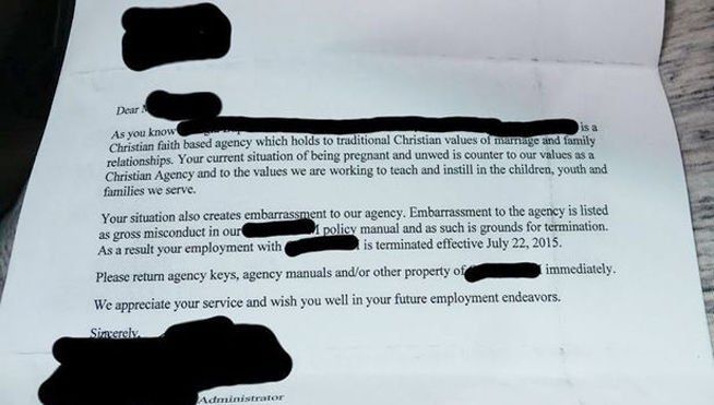 Una mujer embarazada ha decidido compartir a través de la web reddit la carta de despido de la compañía en la que trabajaba, y en la que le explican que el hecho de que vaya a ser madre sin estar casada es una "vergüenza" para la empresa, y eso provoca que la tengan que despedir, tal y como recoge el tabloide británico Mirror.