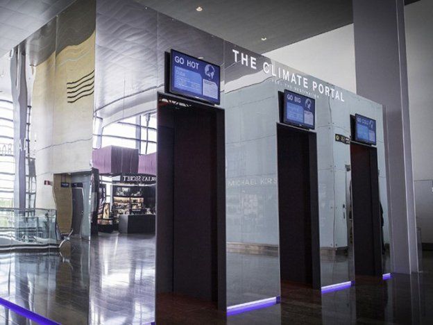 La brillante cabina, la cual estará disponible hasta finales de agosto, utiliza datos en tiempo real de alrededor del planeta para simular una variedad de ambientes climáticos.Estos están separados en tres habitaciones: cálido, frío y grande.