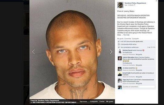 Jeremy Meeks, de 30 años, fue arrestado la semana pasada acusado de posesión ilegal de armas y de pertenecer a un clan criminal. Sin embargo, eso no fue problema para que miles de mujeres (y también algunos hombres) comentaran su atractivo físico en la fotografía colgada por la Policía en internet. Dicha imagen ya cuenta con 86.000 «Me gusta», ha sido compartida 11.100 veces y tiene más de 23.600 comentarios.