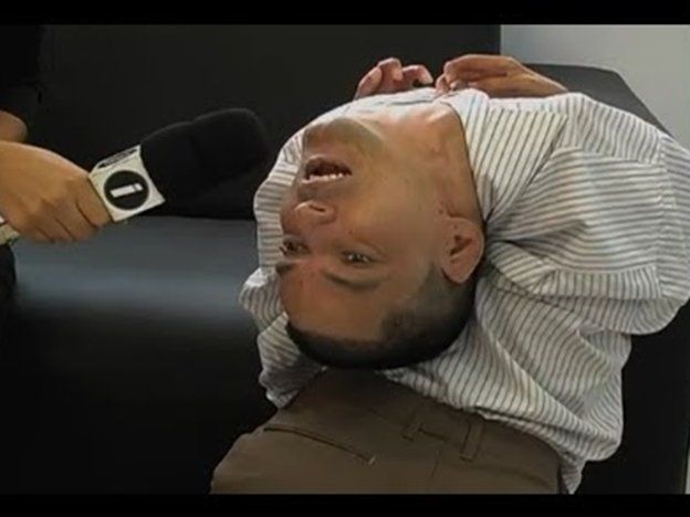 Para Claudio Vieira de Oliveira, de Montse Santo (Brasil) llevar a cabo tareas tan simples como cambiar de canal o comer resultan casi imposibles. Y es que, este hombre de 37 años cuenta con varias dolencias que hacen que sus brazos y sus piernas estén gravemente deformados y le sean inútiles para desenvolverse en la vida diaria. Sin embargo, por lo que realmente ha saltado a la fama este brasileño es por haber nacido con el cuello tan doblado hacia atrás que su cabeza queda suspendida boca abajo sobre la espalda.