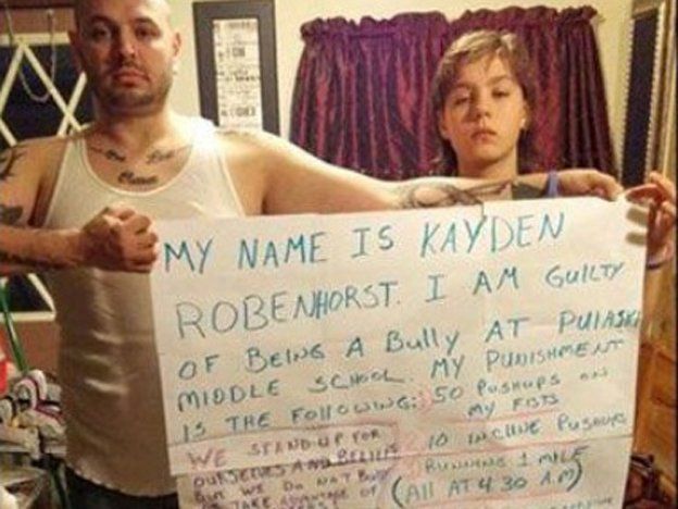 Según constata el Mail Online, Timothy obligó a su hijo a realizar trabajos de jardinería, sesiones de ejercicios a primera hora de la mañana y también aprender a pedir perdón. Así, Kayden tuvo que levantarse por un buen tiempo a las 04:30 de la mañana a hacer flexiones y a correr cuadras y cuadras bajo frías temperaturas. Todo esto junto con disculparse ante toda su clase por hacer bullying.