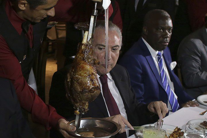 Temer intentó reducir los daños para la economía durante su presentación en la Cámara de Comercio Brasil-Estados Unidos en San Pablo, donde afirmó que existe un número "diminuto" de frigoríficos involucrados en la supuesta red desbaratada por la PF la semana pasada.