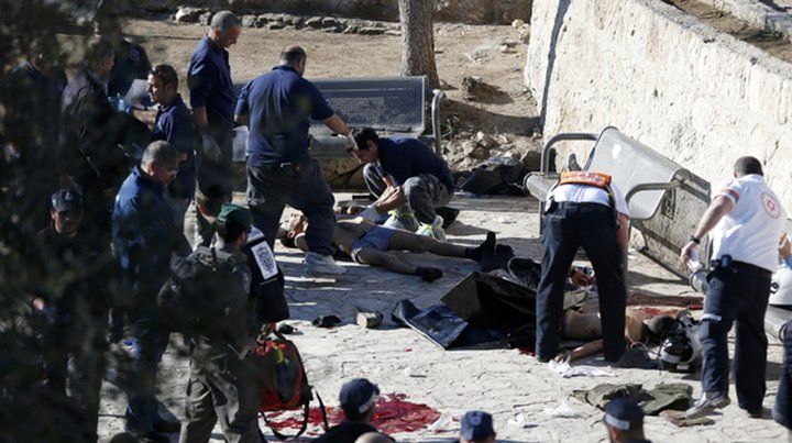 El jefe de la policía de Jerusalén, Yoram Halevy, identificó a los tres atacantes como palestinos de Cisjordania. Según la policía, dos atacantes dispararon contra un grupo de policías que replicaron, al mismo tiempo que otro hombre apuñalaba a la policía a unos metros del lugar, antes de ser ultimado. Los médicos afirmaron que otras cuatro personas resultaron heridas.