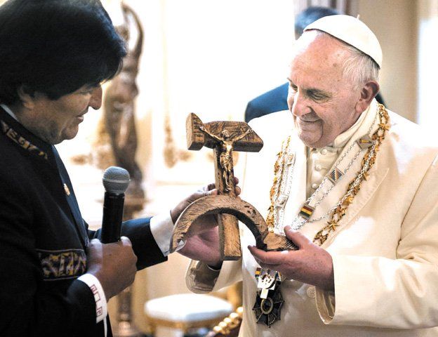 Morales sorprendió al pontífice con el presente inusual –un crucifijo tallado y unido al símbolo comunista de la hoz y el martillo– cuando Francisco llegó a La Paz el miércoles.