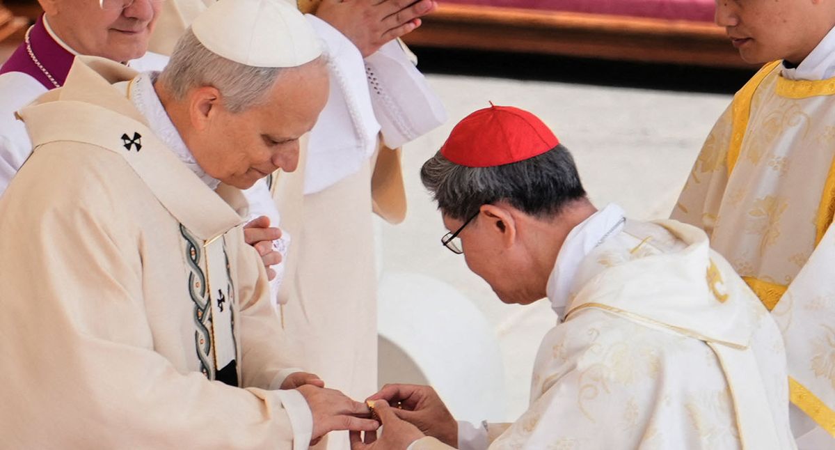 Durante la misa el papa León XIV recibió los símbolos tradicionales del pontificado: