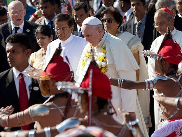 En una muestra de coexistencia étnica, sin embargo, la bienvenida al pontífice incluyó con percusionistas tradicionales y bailarines de la etnia mayoritaria cingalesa y la minoría tamil, así como un coro de niños interpretando una canción de bienvenida en las dos lenguas de Sri Lanka — además de inglés e italiano.