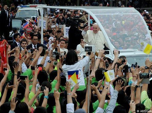 Vestido con un impermeable amarillo, el papa sonrió y saludó a la muchedumbre y se detuvo varias veces para besar a los bebés que le acercaban. Luego llegó al estrado para una misa de unas dos horas.Filipinas es el principal bastión católico en Asia, donde 80% de los 100 millones de habitantes del país, una antigua colonia española, practican un catolicismo ferviente.