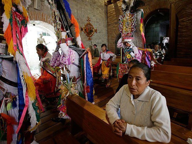 Luego se trasladaron a la iglesia de la comunidad para bailar en honor del día de la Sagrada Eucaristía, que los católicos consideran como el cuerpo y sangre de Jesucristo.Otros festivales son predominantemente católicos, como una procesión reciente en Quito en honor del Sagrado Corazón de Jesús. Pero los participantes mismos eran en su gran mayoría indígenas: desde el hombre que cargaba un enorme retrato enmarcado de un Jesús rubio, hasta la mujer vestida como Nuestra Señora de los Dolores, con largas túnicas y tocado de púas metálicas, pasando por las niñas pequeñas con disfraces de ángeles con alas de plumas reales.En Bolivia, las ceremonias de ofrenda a Pachamama incluyen a sacerdotes andinos orando el Padre Nuestro, mientras que los sagrarios a la Madre Tierra en la montaña también tienen cruces cristianas.La edición 2009 del Atlas Sociolingüista de Latinoamérica señala que 71% de las personas de las tierras altas de Ecuador son indígenas, mientras que en Bolivia esa proporción es del 90%.Fuente: AP