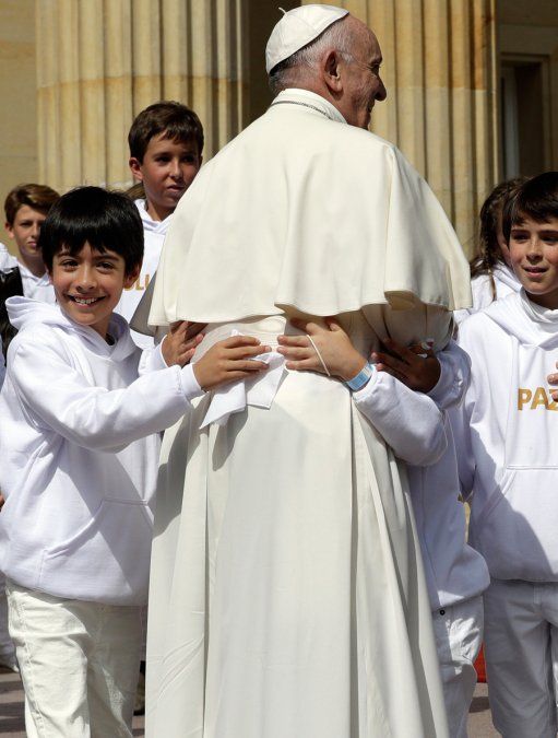Francisco, que llegó el miércoles en la tarde a Bogotá, tuvo la jornada más "política" de su gira de 5 días por el encuentro con Santos en la Casa de Nariño, donde fue recibido con honores como jefe de Estado del Vaticano. "Quise venir hasta aquí para decirles que no están solos, que somos muchos los que queremos acompañarlos en este paso; este viaje quiere ser un aliciente para ustedes, un aporte que en algo allane el camino hacia la reconciliación y la paz", señaló ante el presidente y unos 700 invitados en la Plaza de Armas del palacio.