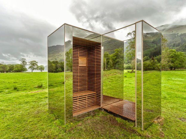 Este extraño edificio casi invisible es un refugio en Escocia. Se encuentra en el Parque Nacional Trossachs, cerca de Loch Lomond, y es obra de los estudiantes de arquitectura Angus Ritchie y Daniel Tyler como parte de su tesis de fin de carrera. La pequeña construcción está recubierta de espejos. Al estar completamente rodeada de un paisaje natural, eso hace que la cabaña se funda en el entorno desde algunos ángulos.