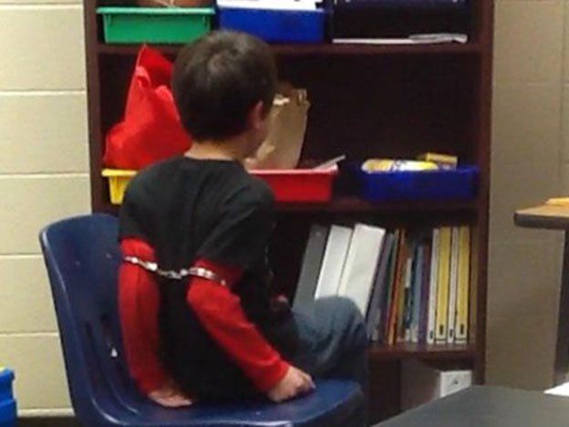 El niño, de 24 kg de peso, permaneció así alrededor de 15 minutos.El video muestra al niño con las esposas colocadas alrededor de los bíceps, un poco más arriba del codo. Sus muñecas son demasiado pequeñas."No puedes intentar golpearme así", le dice el agente de seguridad Kevin Sumner al niño, que llora a lo largo de todo el video."Puedes hacer lo que te pedimos o sufrir las consecuencias", reta el agente mientras el niño se queja del dolor."Siéntate en la silla como te he dicho", ordena Sumner.ACLU recuerda que las directrices sobre el uso de esposas prohíben que se usen con niños pequeños.El caso de S.R. ocurrió en agosto de 2014 pero la demanda fue presentada esta semana.Según la acusación, la niña , L. G., de la que no hay imágenes, fue esposada con el mismo método dos veces.Diagnóstico de TDAH Según ACLU, el chico del video, así como la niña de 9 años que también fue esposada por Sumner, tienen un diagnóstico de trastorno de déficit de atención e hiperactividad (TDAH).En los casos denunciados, ambos fueron castigados por comportamientos relacionados con su trastorno. Ninguno de los dos fue arrestado o acusado de nada, y ACLU presentó la demanda en su nombre.ACLU alega que la oficina del alguacil del condado de Kenton violó la Ley de Estadounidenses con Discapacidades por el trato dado a estos niños.Las leyes del estado de Kentucky prohíben a los funcionarios de las escuelas sujetar o someter a niños que se sabe tienen una discapacidad.La proporción de menores con alguna discapacidad es del 12% de los estudiantes de las escuelas públicas en EE.UU., pero suponen el 75% de los estudiantes que son físicamente sometidos por adultos en las escuelas, según datos del Departamento de Educación de EE.UU."Encadenar a niños no está bien. Es traumatizante y en este caso además es ilegal", dijo en un comunicado Susan Mizner, consejera de ACLU para temas de discapacidad."Estas medidas disciplinarias también alimentan 'el llamado conducto de la escuela a la prisión', en el que los niños son lanzados como en un embudo desde las escuelas públicas al sistema de justicia penal", añade el comunicado de ACLU.Un abogado de la oficina del alguacil le dijo a la agencia de noticias Associated Press que Sumner sujetó a los niños porque "estaban poniendo a los demás y a sí mismos en peligro y eso es lo que se debe hacer en esos casos".