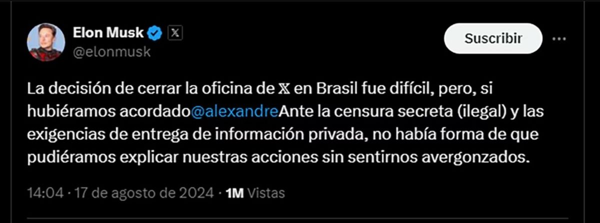 "En consecuencia, para proteger la seguridad de nuestro personal, hemos tomado la decisión de cerrar nuestras operaciones en Brasil con efecto inmediato. El servicio X sigue estando disponible para la población de Brasil", prosiguió.