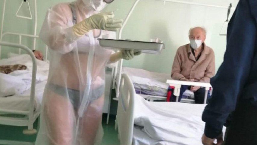 Según medios locales, la enfermera de 20 años decidió usar el bikini bajo su traje impermeable protector para aplacar el intenso calor que se siente en tierras rusas. Sin embargo, no se percató que la transparencia de su atuendo iba a permitir que sus compañeros y los pacientes puedan ver su singular atuendo.