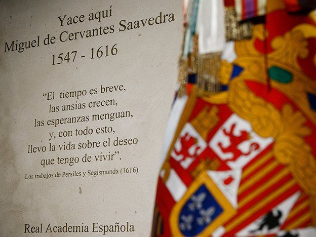 La alcaldesa Ana Botella depositó una corona de laurel en el monumento funerario instalado en el templo. Se trata de una placa tallada de piedra caliza sobre un soporte de granito. El texto de la lápida fue redactado por la Real Academia Española de la lengua: "Yace aquí Miguel de Cervantes Saavedra 1547-1616. El tiempo es breve, las ansias crecen, las esperanzas menguan, y con todo esto, llevo la vida sobre el deseo que tengo de vivir". Los versos son de "Los trabajos de Persiles y Segismunda", la última obra de Cervantes.El autor recibió honores militares como soldado de España por parte de los regimientos del Ejército herederos de los tercios en los que militó.