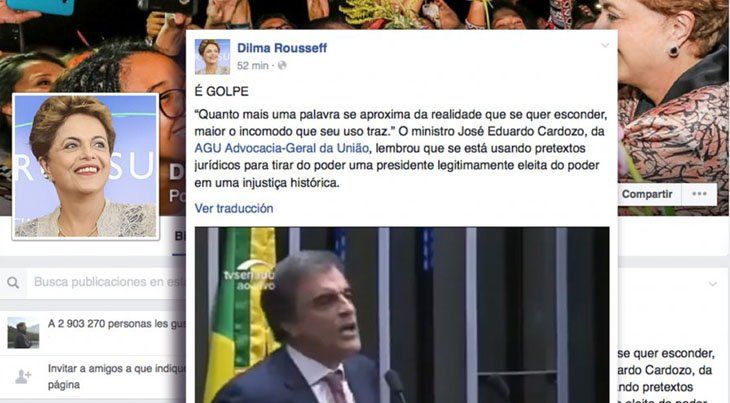 "Es un golpe", es el título del post de Rousseff, que comentó el discurso de su defensor, el abogado general José Cardozo, al afirmar que "se están usando pretextos para sacar del poder a una presidenta legítimamente electa del poder en una injusticia histórica", "Cuanto más una palabra se aproxima de la realidad que se quiere esconder, más grande es la incomodidad que su uso lleva", dijo Rousseff. El Senado de Brasil aprobó esta mañana la realización de un juicio político a Rousseff, quien hoy mismo dejará el gobierno en manos del vicepresidente Michel Temer por hasta 180 días, el plazo máximo que tendrá la Cámara alta para llevar adelante el proceso.