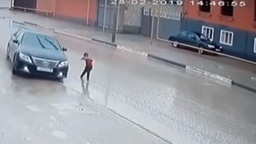 El video, recogido el sábado por la cadena rusa de televisión RT, muestra al pequeño queriendo cruzar la calle, solo, sin mirar para ambos lados. Al estar ya en el medio de la vía, recién mira el niño para su derecha y advierte que venía un auto negro a gran velocidad.