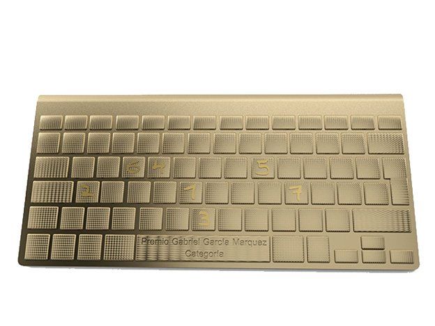 "La propuesta de Antonio Caro es un bronce con hojilla de oro que representa un teclado de computador en tamaño natural. Las teclas, sin embargo, carecen de letras. Sólo las que corresponden al nombre 'Gabriel' están marcadas, pero no con letras, sino con números. Estos forman la secuencia que seguirían los dedos de una persona al escribir el nombre 'Gabriel'. Mientras que todo el teclado es de bronce, los números son destacados con la hojilla de oro", explicó la Fundación Gabriel García Márquez para el Nuevo Periodismo Iberoamericano en un comunicado.