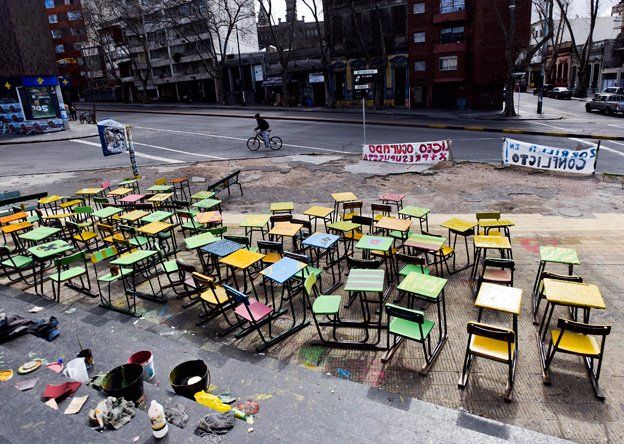 La foto.Símbolos. Estos escritorios de estudiantes han sido dispuestos en la calle por profesores de colegios secundarios en Montevideo, Uruguay.