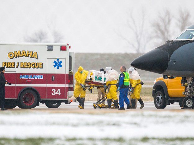 El doctor Martin Salia, diagnosticado con ébola el 10 de noviembre, aterrizó el sábado por la tarde en el aeropuerto de Eppley Airfield en Omaha, y fue trasladado en ambulancia al Centro Médico de Nebraska.