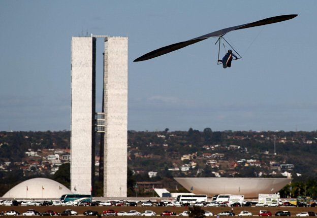 La foto del día. Panorámica. Con el edificio del Congreso Nacional de Brasil en el fondo, el piloto de un planeador hace su aproximación final a la tierra durante la competición del Abierto de tenis de Brasil que se desarrolla en la ciudad de Brasilia.