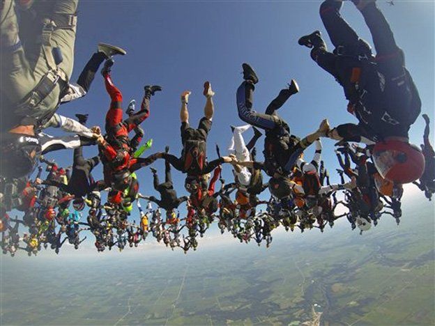 La foto del día. Récord en las nubes. Los integrantes de un equipo internacional de paracaidistas se dan la mano mientras vuelan cabeza abajo, para batir el récord mundial de formación en paracaidismo en el cielo de Illinois.