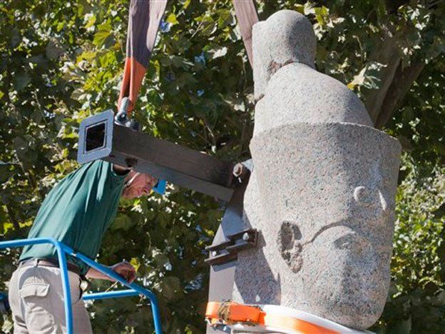 Tres estatuas egipcias gigantes que estuvieron sumergidas en el mediterráneo durante más de un milenio comenzaron a exhibirse en París.El museo del Instituto del Mundo Árabe erigió los monumentos de granito el viernes como adelanto para su muestra "Osiris: Misterios del Egipto sumergido", que se inaugura el 8 de septiembre. La muestra incluye cerca de 300 piezas, la mayoría descubiertas en excavaciones submarinas del arqueólogo marino francés Frank Goddio.