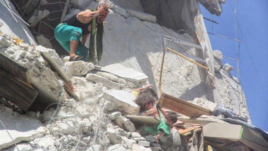 La foto aparece sin cesar en las redes sociales: dos niñas atrapadas en un inmueble derrumbado apenas logran sostener de la camiseta desgarrada a su hermana pequeña, que queda suspendida a varios metros del suelo, tras un bombardeo aéreo en el noroeste de Siria.