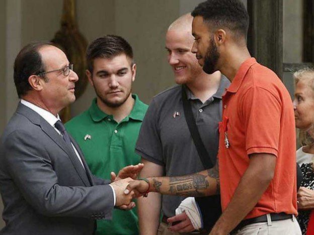 Después, Hollande impuso la medalla de la Legión de Honor al miembro de la Fuerza Aérea estadounidense Spencer Stone, al guarda nacional Alek Skarlatos y a su amigo de la infancia Anthony Sudler, que redujeron al hombre cuando avanzaba por el tren con un rifle de asalto. El empresario británico Chris Norman, que también intervino en la refriega, también fue condecorado.Los hombres mostraron "que enfrentados al terror, tenemos el poder de resistir. Ustedes también dieron una lección de coraje, voluntad y por lo tanto de esperanza", aseguró Hollande.