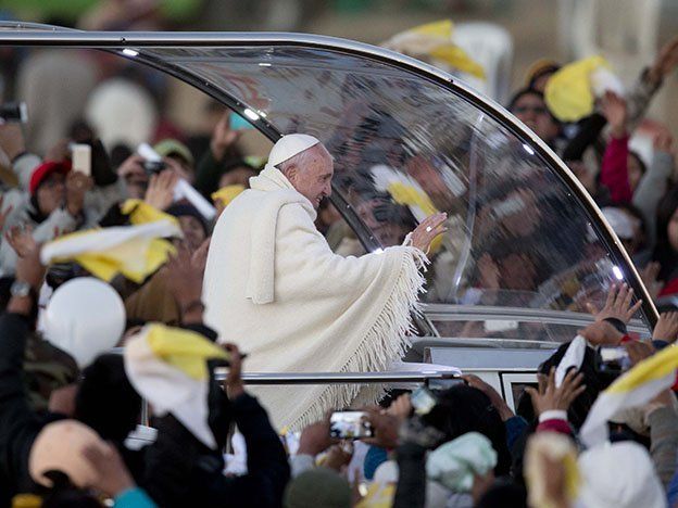El pontífice fue recibido en el aeropuerto de El Alto, a 4.000 metros de altitud, por el presidente Evo Morales, quien le entregó una chuspa, una pequeña bolsa de tejido andino. "Recibimos con los brazos y el corazón abierto al papa de los pobres", dijo Morales en la ceremonia de bienvenida.De buen semblante a pesar de la altura y el frío invernal, el pontífice saludó a niños vestidos con ropa típica de las regiones bolivianas -uno de los cuales, vestido de machetero, se tomó una histórica selfie con Francisco.