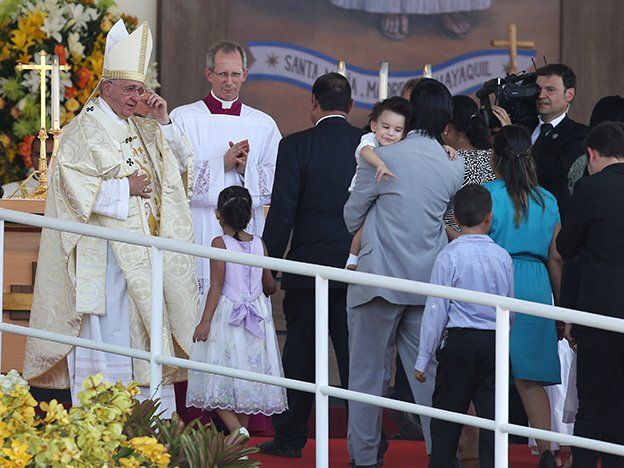 Destacó el papel de la mujer en la familia e incluso recordó una anécdota de que en alguna ocasión le preguntaron a su propia madre que a cuál de sus cinco hijos quería más. "Y ella dijo: 'como los dedos, si me pinchan este me duele lo mismo que si pinchan este", refirió el papa mientras tocaba su mano. "Una madre quiere a sus hijos como son", expresó. La multitud, dividida en 30 bloques, algunos de los cuales lucían a media ocupación, escuchó con profunda devoción a Francisco."Lo más lindo, lo más bello y lo más profundo para la familia; está por venir. El mejor de los vinos está en la esperanza de cada persona que se arriesga al amor. En la familia hay que arriesgarse al amor", afirmó Francisco..Poco antes estuvo en el Santuario de la Divina Misericordia, donde oró con cientos de enfermos oncológicos, ancianos y gente muy pobre con quienes bromeó al ofrecer no cobrar por su bendición."Antes de irme, les doy la bendición. No les voy a cobrar nada, pero les pido por favor que recen por mí, ¿me lo prometen?" y la gente respondió al papa con un sonoro ¡Sí!A su arribo a Guayaquil el papa fue recibido en el aeropuerto de esa ciudad por el vicepresidente Jorge Glass, el canciller Ricardo Patiño y el alcalde Jaime Nebot, quien le entregó las llaves de la ciudad, una joya diseñada con un topacio, perlas oro y plata.Ecuador es la primera parada del papa en una gira que lo llevará también a Bolivia y Paraguay, tres de los países más pequeños y pobres de Sudamérica.En Samanes, donde las autoridades estimaron la presencia de centenas de miles personas, la sensación térmica llega a los 39 grados centígrados y los bomberos cada cierto tiempo lanzan agua sobre la multitud, algunos de los asistentes fueron atendidos por insolación.Tras caminar 40 kilómetros, Vicente Huilcatoma, un policía retirado y chofer de transporte escolar de 47 años, llegó a Samanes la tarde del domingo para buscar un buen lugar para ver al papa."Estoy cansado, con hambre, no he dormido, pero también siento emoción y gozo en mi corazón. He llegado a la zona más cercana para ver a Francisco. Vine a pedir por la salud de mi esposa y mis hijas. Ellas no pueden estar aquí conmigo", dijo a AP mientras mostraba orgulloso una camiseta con la leyenda "Con Cristo, el corazón nunca envejece".Guayaquil, ubicada a 270 kilómetros al suroeste de la capital y la más poblada del país con 2,5 millones de habitantes, no estaba en los planes iniciales de la visita de Francisco, quien alteró su agenda para encontrarse con los feligreses de esa ciudad.La edad no es impedimento para nada, repetía Guillermina Aveiga Dávila, una contadora jubilada de 90 años que llegó a Samanes en la madrugada del lunes desde su natal Chone, 185 kilómetros al suroeste de Quito."No uso silla de ruedas aún. Hago mi esfuerzo y camino... Veo todavía perfectamente gracias a los lentes, aunque estoy un poco sorda del oído izquierdo. Al papa le pediré que interceda para que Dios me dé más salud. Quiero llegar a los 100 años", añadió a AP.Después de la misa, el papa se dirigirá al colegio jesuita Javier donde cumplirá dos actividades privadas: se encontrará con un antiguo amigo, el español Francisco Cortez García más conocido como Padre Paquito, a quien no ve desde hace 30 años, y almorzará con un grupo de 20 sacerdotes jesuitas de todo el país.Al final de la tarde regresará a Quito para completar la jornada con un encuentro privado con el presidente Rafael Correa y poco después visitará la Catedral, donde se espera que de un discurso.