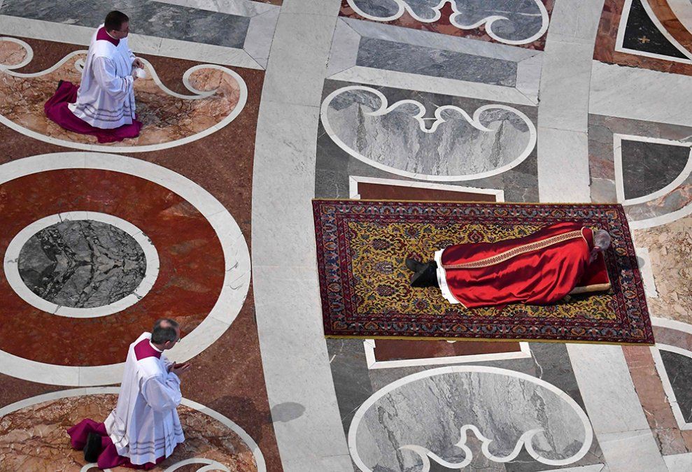 Antes del Vía Crucis, el Pontífice, vestido de rojo, se acostó sobre un tapete en la Basílica de San Pedro, sin cruz pectoral, como símbolo de que Jesús ha muerto.