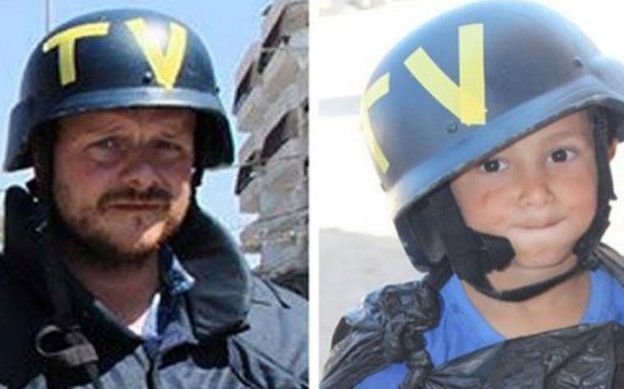 El pequeño usa una bolsa de plástico como un chaleco de periodista y usa un casco, prestado por el colega, para completar el atuendo.