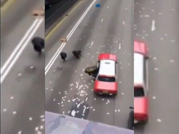 Los billetes cayeron sobre una avenida, lo que provocó locura entre las personas que se encontraban en el lugar.