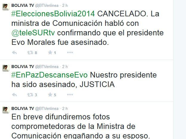 El jefe de Estado y candidato a la reelección rechazó los rumores y la vulneración de la cuenta de la red social Twitter de la estatal Bolivia TV, desde donde se emitieron los rumores; y afirmó que los mismos se deben al temor de la oposición política en ese país.