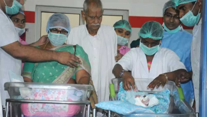 Sitarama Raja Rao, de 80 años. Ellos viven en la aldea Nelaparthipadu del bloque Draksharamam en el distrito East Godavari. El parto ocurrió en el Hospital Ahalya en Kothapet a través de la cesárea alrededor de la media mañana del jueves.