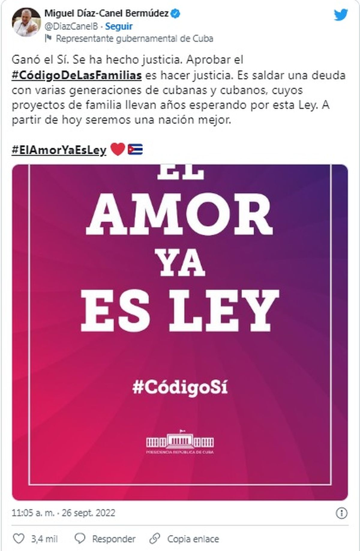 "Aprobar el #CódigoDeLasFamilias es hacer justicia. Es saldar una deuda con varias generaciones de cubanas y cubanos, cuyos proyectos de familia llevan años esperando por esta Ley. A partir de hoy seremos una nación mejor", añadió el mandatario.