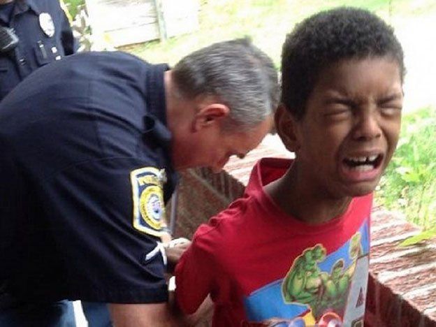 Hill luego de que su hijo se negara a hacer la tarea del colegio y le contestara mal a su maestra de 5º grado, decidió pedir ayuda a la policía local, para someter al pequeño a un simulacro y así darle una lección. Subió luego las imágenes a su cuenta de Facebook, donde se ve al chico que rompe en llanto mientras los policías lo esposan y lo suben a un patrullero.