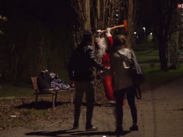 La fórmula es la misma que la aplicada en la broma de los payasos, Papá Noel merodea por la noche en un pueblo italiano y asusta a varios peatones.