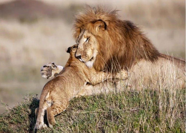 En una de las fotos el león entorna los ojos mientras acurruca a su hijo, de la misma manera que lo hacen los progenitores humanos con sus vástagos.