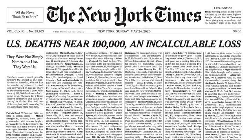 La histórica tapa fue anticipada por el diario, uno de los más prestigiosos del mundo, durante la tarde de este sábado y en la imagen se lee un título que ocupa todas las columnas de la primera página con el enunciado: "Las muertes en EE.UU. se acercan a 100.000, una pérdida incalculable".