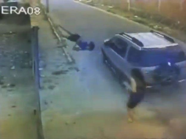 El video fue filmado por cámaras de seguridad de un centro comercial en Fortaleza y muestran cómo un auto atropella a una mujer y luego sigue su marcha sin detenerse a asistir a la víctima.
