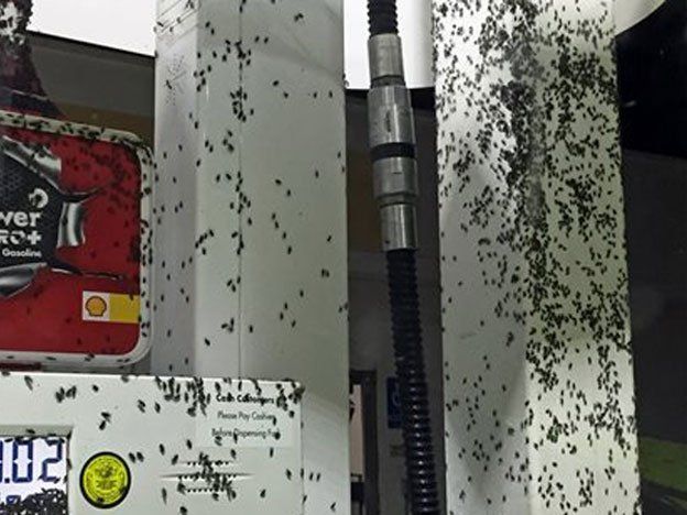 El piso de una estación de servicio estaba cubierto de pequeños insectos alados. A los lados, los montones de bichos muertos formaban cúmulos de varios centímetros de altura.En las rutas, los insectos caían como lluvia sobre los parabrisas de los vehículos. Miles volaban hacia la más pequeña fuente de luz y otros caminaban por ventanas y mesas en las cocinas.