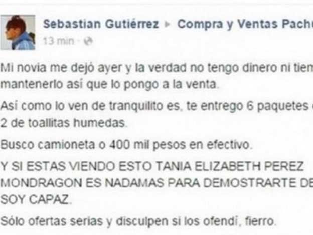 "Mi novia me dejó ayer y la verdad no tengo dinero ni tiempo para mantenerlo así que lo pongo a la venta", escribió Sebastián Gutiérrez en una página dedicada a la compra y venta de productos en la ciudad de Pachuca.
