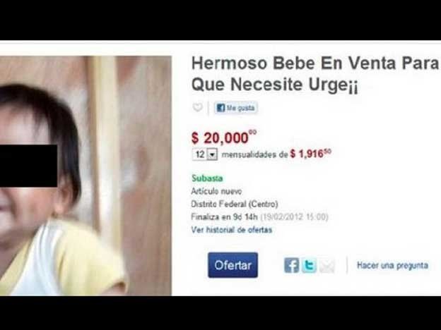 Un usuario anónimo, con ubicación en México, ofreció un bebé por internet y, como monto inicial, fijó 1.570 dólares. En el portal figuraba la leyenda "en venta para órganos o lo que necesite". Lo expulsaron de la comunidad del sitio web.
