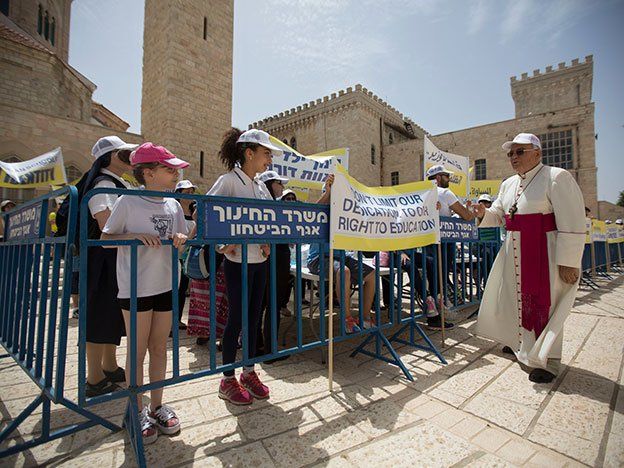 Religiosas vestidas de blanco, un sacerdote con un cetro dorado y docenas de niños escolares árabes efectuaron una manifestación frente al ministerio de educación israelí para manifestar su reclamo inscrito en cartelones grandes: "No interfieran con nuestras escuelas".Las escuelas privadas cristianas se encuentran entre las instituciones educativas de mayor nivel en Israel, establecidas por Iglesias en Tierra Santa desde hace siglos, mucho antes de la creación de Israel. Los administradores de estas escuelas acusan a Israel de reducir sus fondos como táctica de presión para obligarlas a incorporarse al sistema de educación pública de Israel, una medida que según dicen interferiría con los valores cristianos y los altos logros académicos.